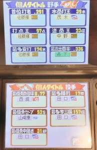 ところが最優秀防御率を獲得したのは、巨人の卓越した中継ぎ西舘投手! 1点台を切る恐るべき投球の魔術が、他のチームの武士(もののふ)たちのバットを空に舞うようしむけたもの。決して当たらぬ魔球は光の速度でキャッチャーミットに収まり、いかなる敵軍に対しても得点を許しませんでした。